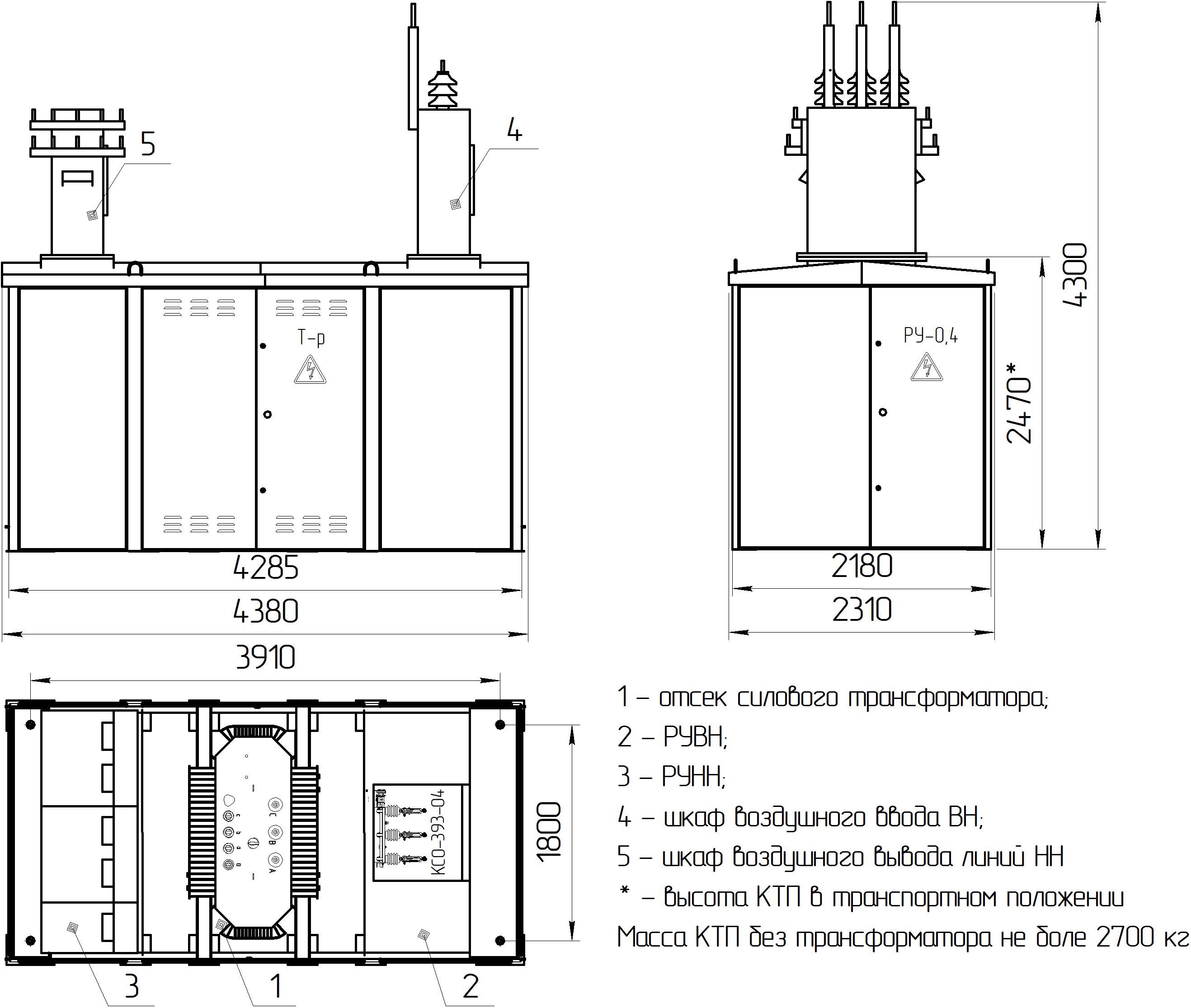Масса КТП ТК-1000 кВА без трансформатора не более 2500 кг. Габаритные размеры: 4380х2310х2400 Цвет КТП по умолчанию серый (RAL7040) |